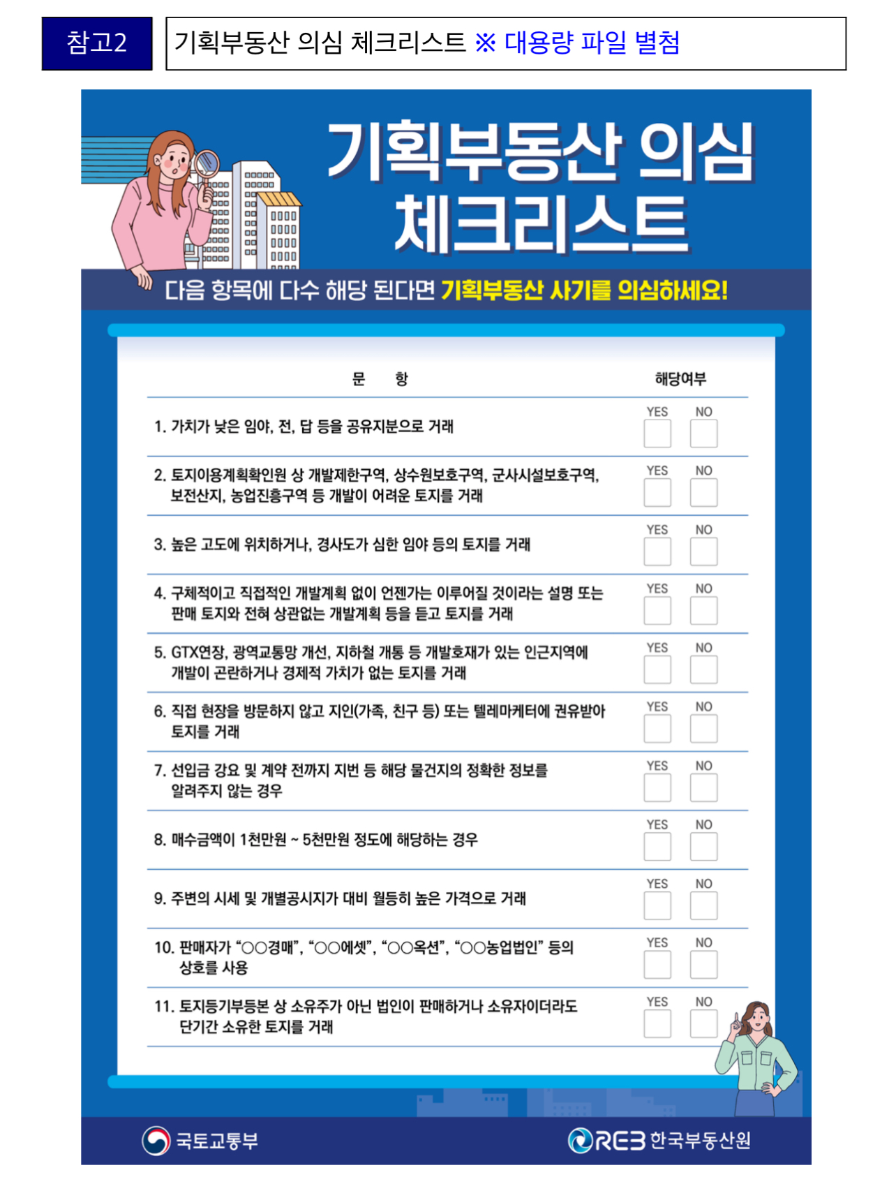 마지막으로 국토교통부 남영우 토지정책관은 “이번 신고기간에 접수된 신고사항은 부동산 거래정보 등을 종합 분석하여 향후 전국 단위 기획부동산, 전세사기 기획조사 시 집중 조사할 계획”이라고 밝혔습니다.