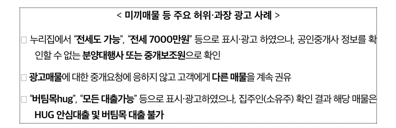 신축빌라 등의 매물을 표시·광고하는 분양대행사는 「공인중개사법」에 따른 개업공인중개사가 아니므로 분양 외 전세 등을 표시·광고하는 것이 불법이며 미끼매물 등 부당광고를 통한 임차인 유인 및 깡통전세 알선은 전세사기로 이어질 가능성이 높아 주의가 필요하다고 합니다.