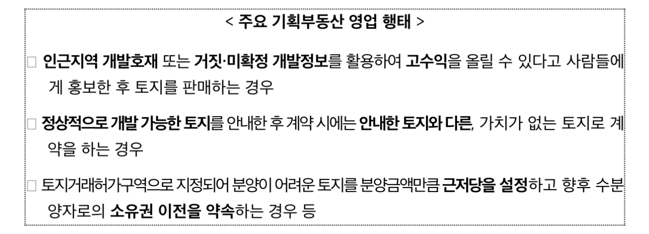 최근 총선을 앞두고 다양한 지역개발 공약을 악용한 기획부동산 우려가 커지고 있는 상황이나 부동산에 대한 이해도가 낮은 일반 서민들은 이에 쉽게 현혹될 수 있어 주의가 요구된다고 합니다.
