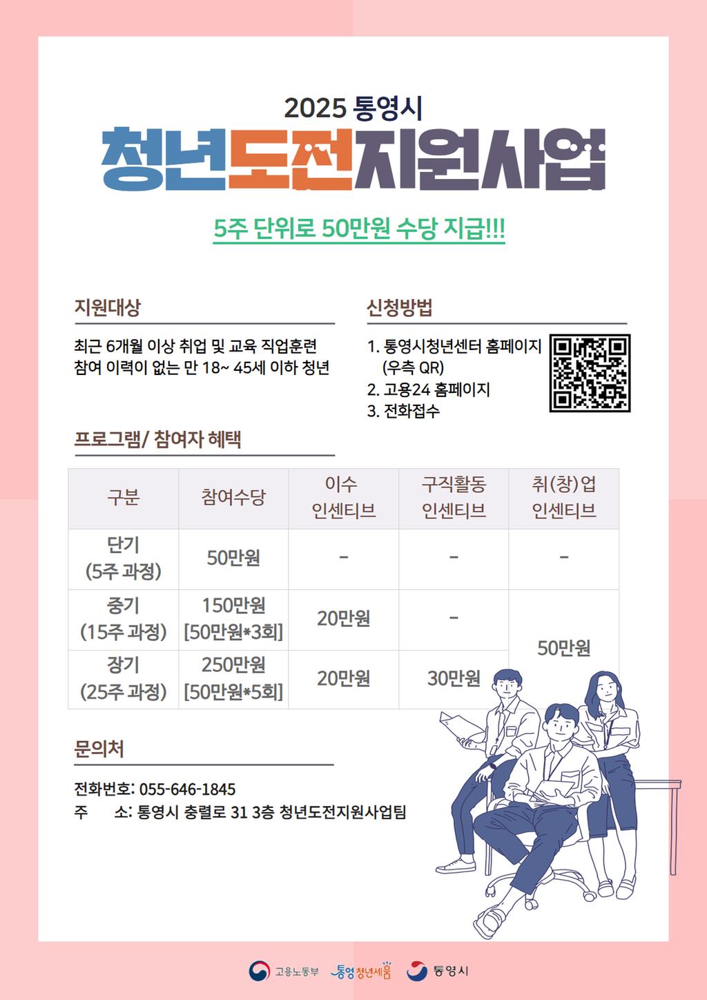 통영시 청년도전 지원사업 세부 모집 및 프로그램 진행 일정에 대한 자세한 사항은 통영시청년센터 청년도전지원사업팀(☎055-646-1845)으로 문의하면 안내받을 수 있으며 통영시청년센터 홈페이지(http://tyseum.or.kr)와 고용24 홈페이지에서 온라인 접수도 가능합니다.