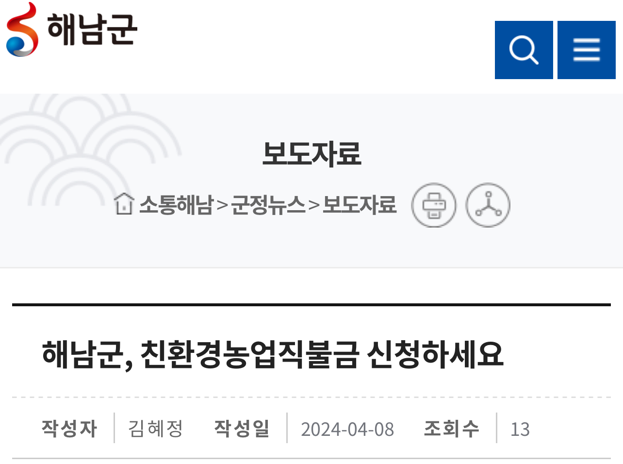 본 설명은 해남군 홈페이지 보도자료