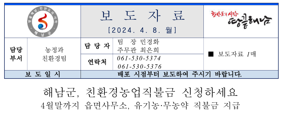 해남군은 친환경 농업인의 초기 소득 감소분과 생산비 차이를 보전하기 위한 친환경농업 직불금을 오는 2024년 4월 30일까지 신청받는다고 밝혔습니다.
