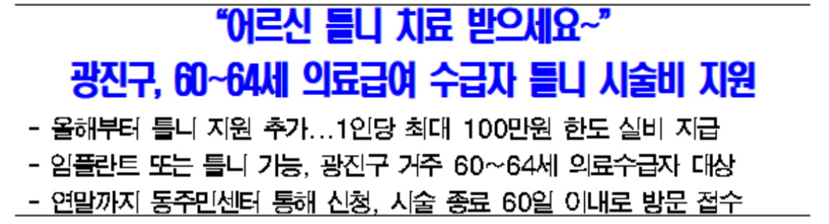 광진구가 60~64세 의료급여 수급자를 대상으로 틀니 시술 비용을 최대 100만원까지 지원한다고 합니다.