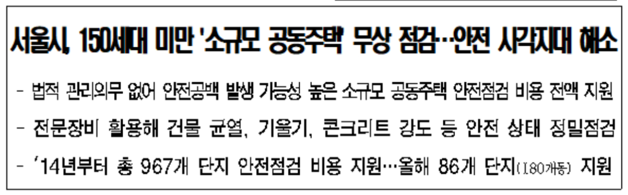서울시가 150세대 미만 소규모 공동주택 86개 단지 총 180개 동에 대한 안전 점검 비용을 전액 지원한다고 밝혔습니다.