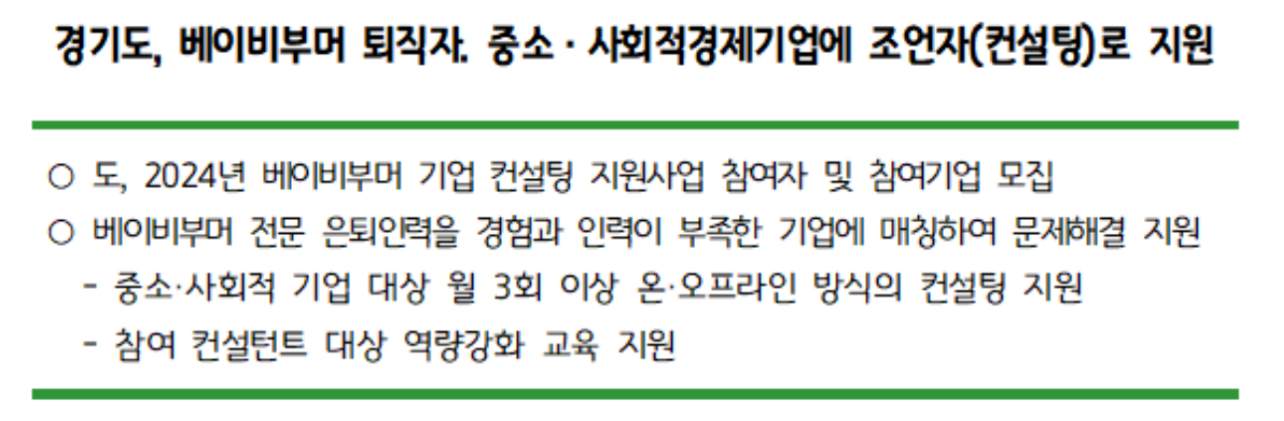 경기도는 2024년 4월 9일부터 인원 마감까지 이런 내용을 담은 ‘2024년 베이비부머 기업 컨설팅 지원사업’ 참여자와 참여기업을 모집한다고 합니다.