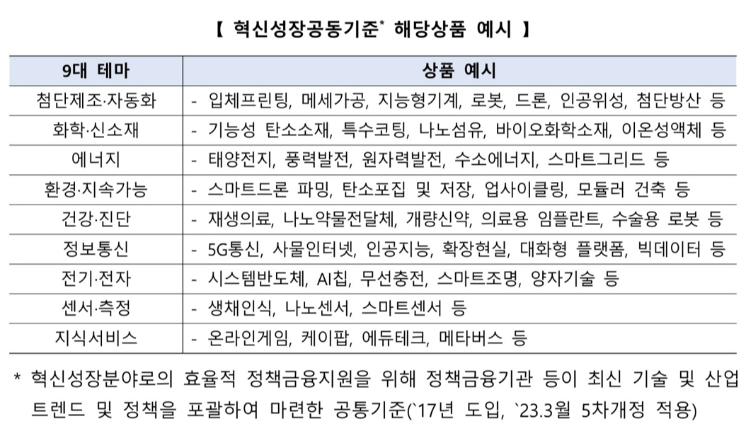 산업은행과 5대 은행은 내부 시스템에 혁신성장공동기준 해당여부를 판단하는 정보시스템을 구축했거나 ‘혁신성장공동기준 매뉴얼’을 통해 개별 확인한다고 합니다.