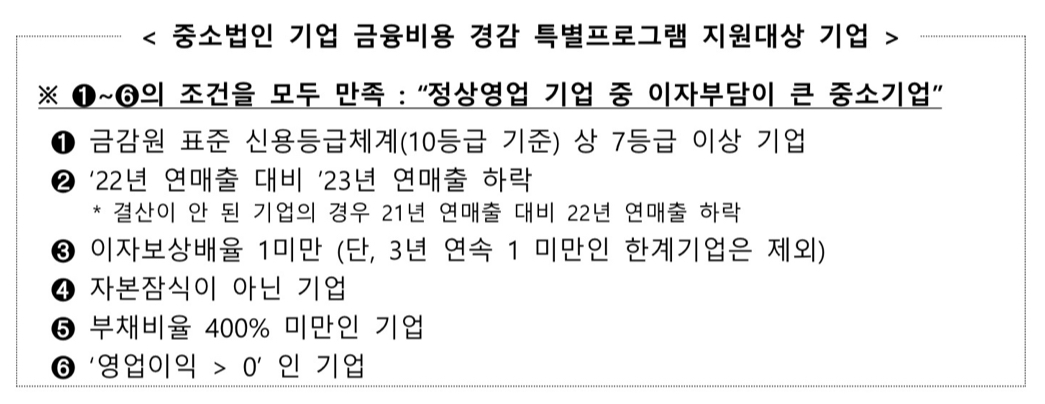 영업이익이 발생하는 등 정상적인 영업을 하고 있지만, 이자부담이 큰 기업을 대상으로 1년간 이자부담을 경감하여 중소기업의 활력을 제고하기 위한 것이라고 합니다.