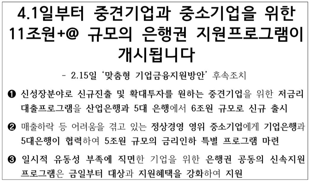 마지막으로 금융위원회는 “지난 2월 발표한 76조원+@ 규모의 ‘맞춤형 기업금융지원방안’이 현장의 기업에게 실질적인 도움이 되도록 조속히 집행하는 한편, 지원실적을 지속 점검해 나가겠다”라고 밝혔습니다.