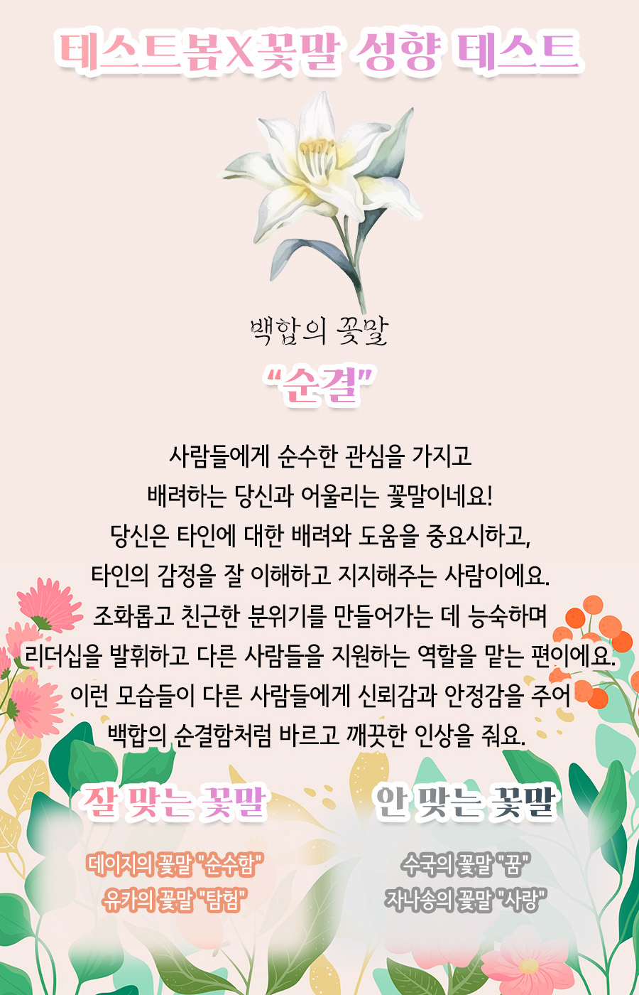 테스트를 통해 당신과 어울리는 꽃말을 알아보는 테스트봄에서 나온 ‘꽃말 성향 테스트’를 소개드리겠습니다.