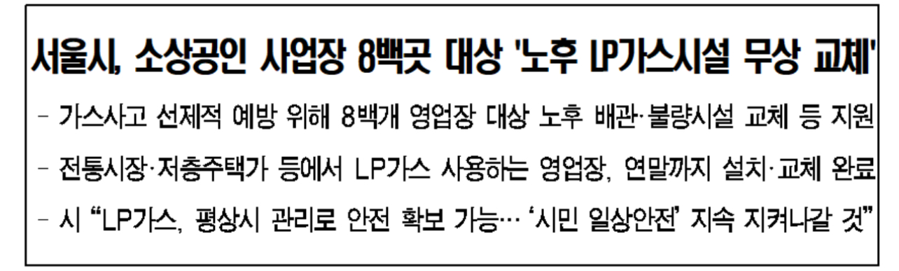 서울시가 LP가스(LPG)를 사용하는 영세 소상공인 사업장 800개소를 대상으로 LP가스시설 개선 사업에 나선다고 밝혔습니다.