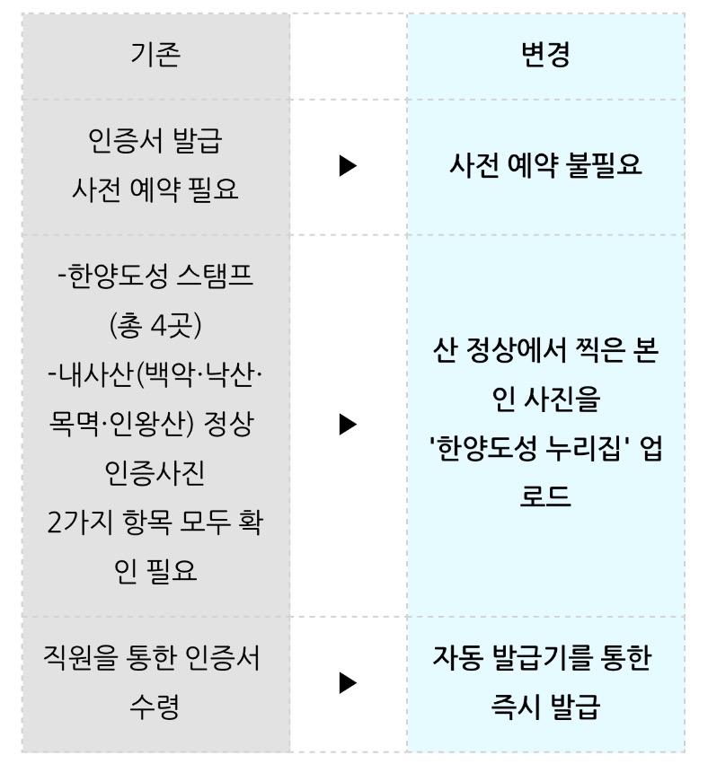 또 기존에 한양도성 스탬프(총 4곳) 인증 대신 산 정상에서 찍은 본 인 사진을 '한양도성 누리집(seoulcitywall.seoul.go.kr)'에 올리기만 하면 받을 수 있게끔 절차를 간소화했다고 합니다.
