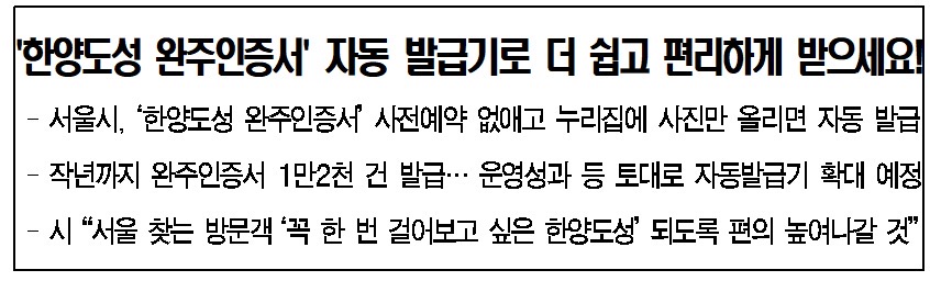서울시는 향후 '한양도성 완주인증서' 발급 등 운영 성과를 지켜보며 자동 발급기의 대수를 점차 늘릴 예정이라고 합니다.