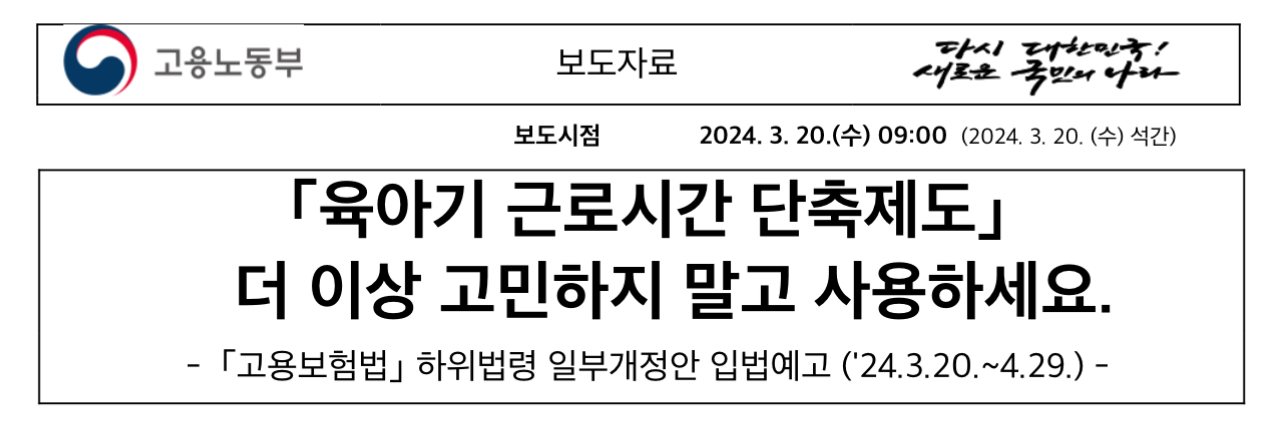 고용노동부(장관 이정식)는 일하는 부모의 일·가정 양립 지원을 위한 고용보험법 하위법령 일부개정안을 마련하고 2024년 3월 20일부터 입법 예고한다고 밝혔습니다.