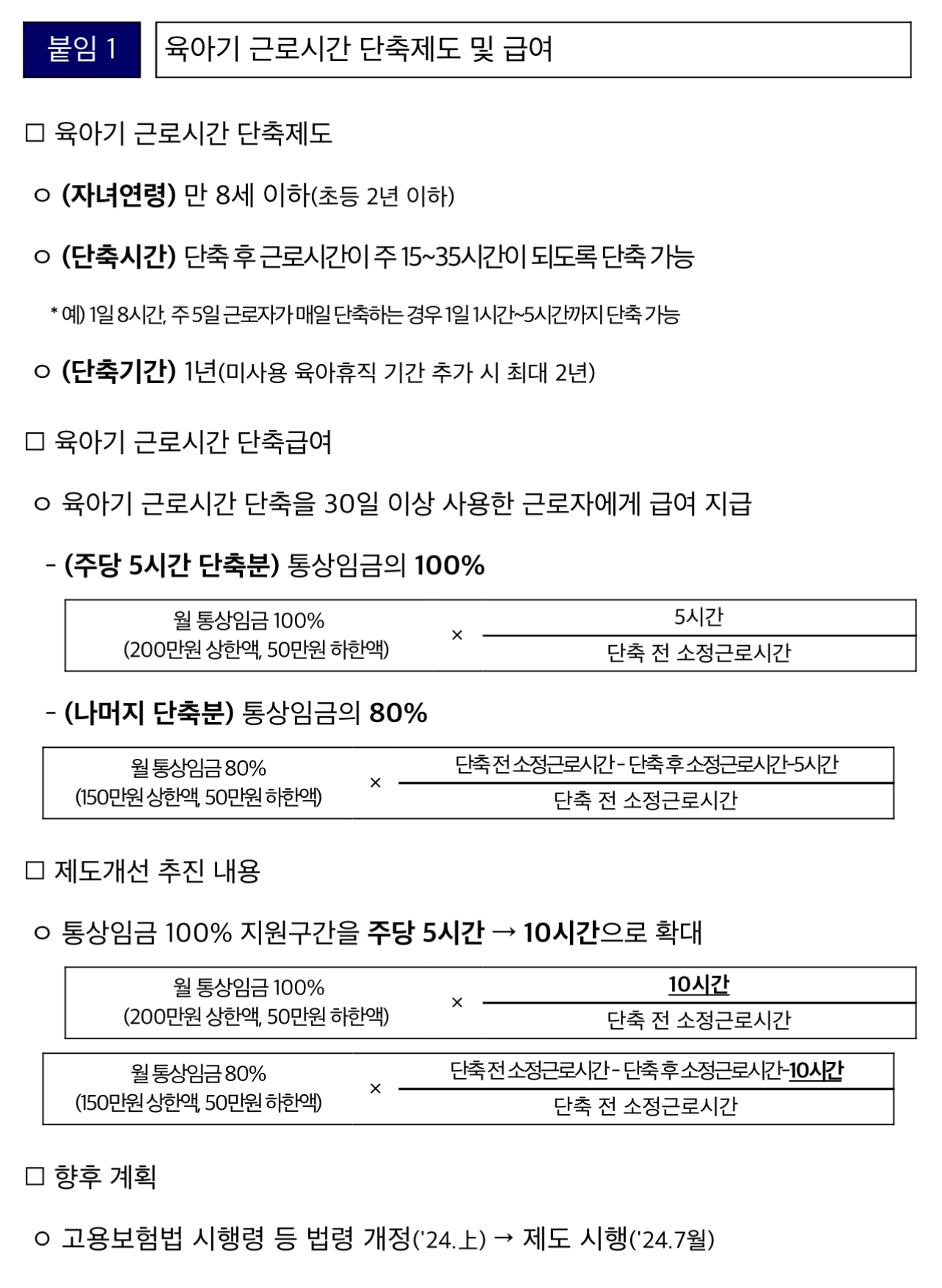 앞으로는 소득 보전을 강화하여 통상임금 100% 지원구간을 주당 최초 5시간에서 최초 10시간으로 확대한다고 합니다.