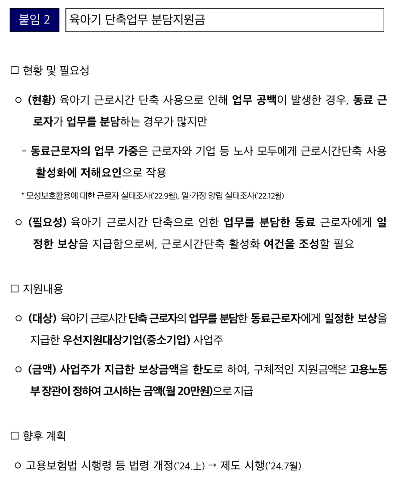 근로자가 육아기 근로시간 단축을 주 10시간 이상 사용하고 그 업무를 분담한 동료 근로자에게 중소기업 사업주가 보상을 지급하면 최대 월 20만원까지 사업주에게 지원금을 지급할 계획이라고 합니다.