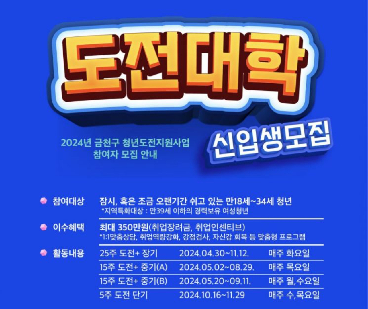 금천구는 2024년 9월 중 단기 과정(5주) 참여자 30명도 모집할 계획이며 자세한 사항은 추후 금천구 누리집 ‘고시·공고’를 통해 별도로 안내할 예정이라고 합니다.