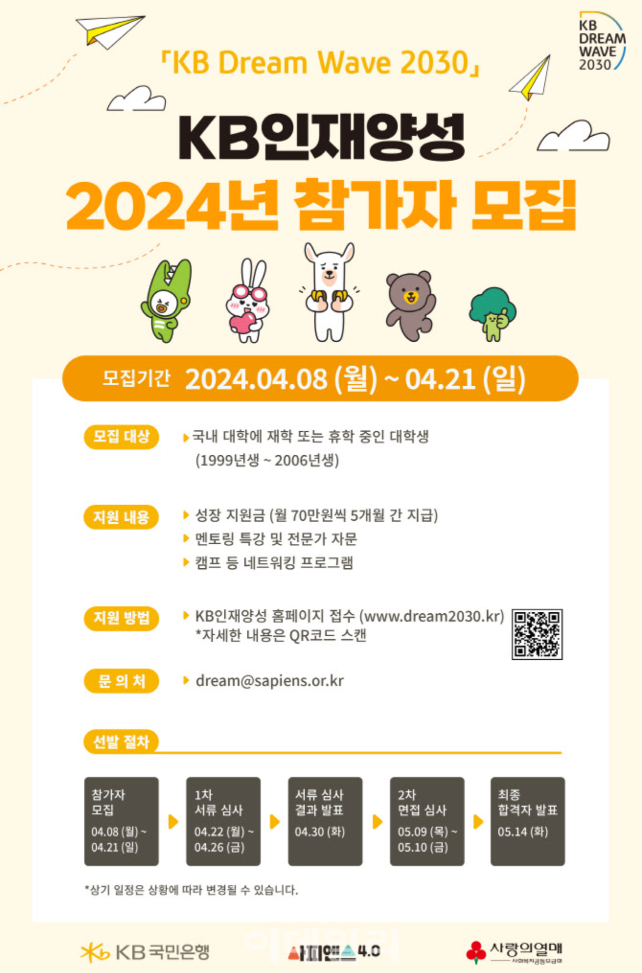 KB인재양성 지원대상은 1999년생부터 2006년생까지로 국내 대학에 재학 또는 휴학 중인 대학생이며 참가 신청은 오는 2024년 4월 21일까지 사피엔스4.0 홈페이지에서 할 수 있습니다.