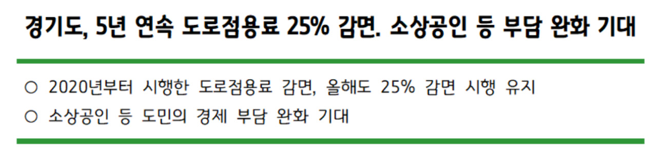앞서 경기도는 코로나19로 인한 소상공인 등의 경제 부담 완화를 위해 2020년 도로점용료 25% 감면을 최초 시행한 바 있습니다.