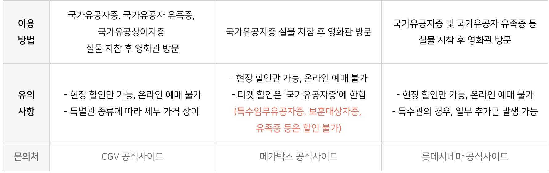 국가유공자 및 군인 영화관 할인 혜택