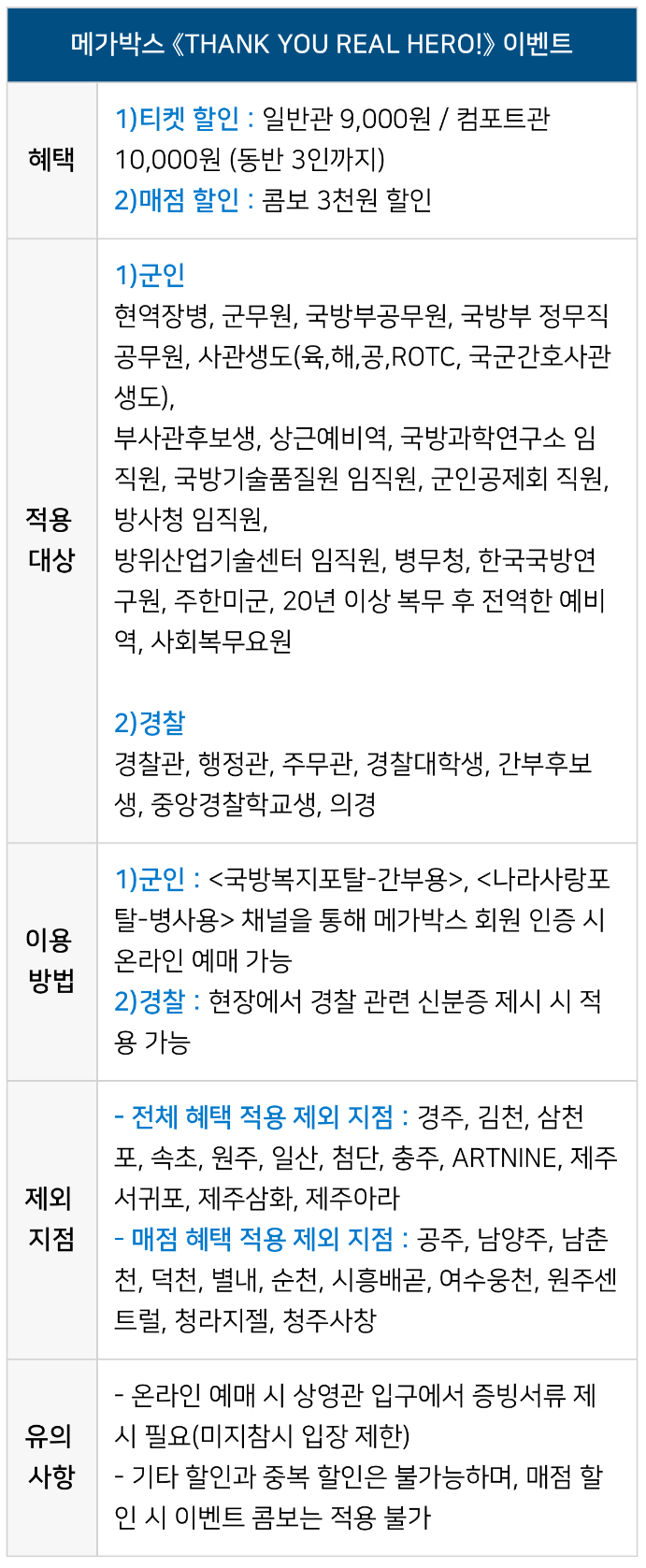그리고 특히 메가박스는 군인, 경찰분들의 헌신에 감사드린다는 마음을 담아 2024년 12월 31일까지 《THANK YOU REAL HERO!》 이벤트를 진행하고 있습니다.