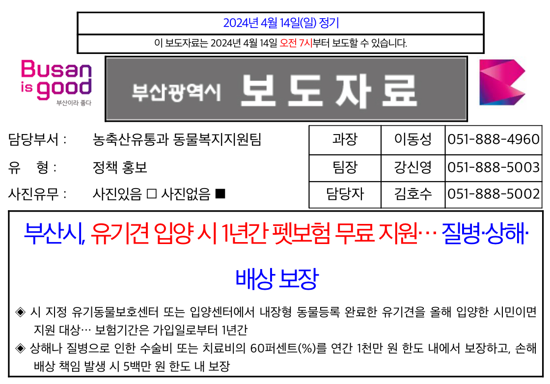 부산시(시장 박형준)는 유기견을 입양한 가족에게 1년간 펫보험을 무료로 지원하는 '유기동물 펫보험 지원사업'을 2024년 4월 15일부터 시행한다고 밝혔습니다.
