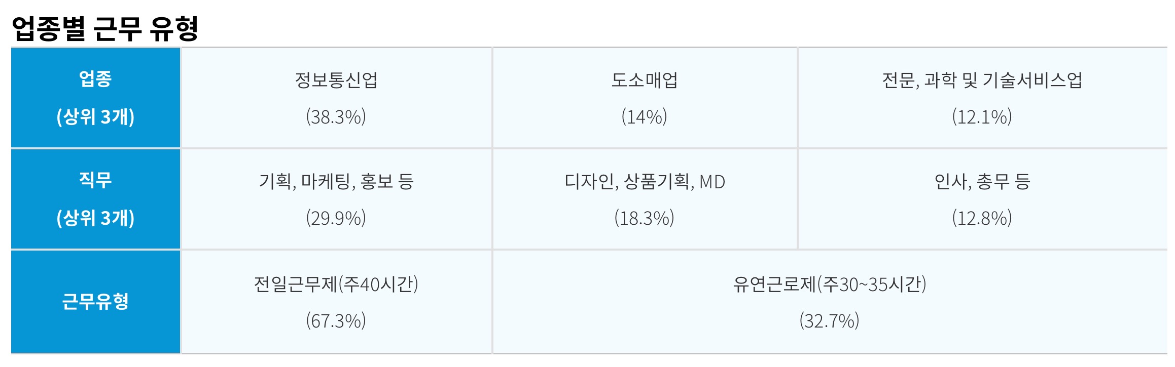 업종별로 보면, 정보통신업이 38.3%로 가장 많고 도소매 및 제조업(14%), 전문, 과학 및 기술서비스업(12.1%), 교육서비스업(8.4%)순이었습니다.