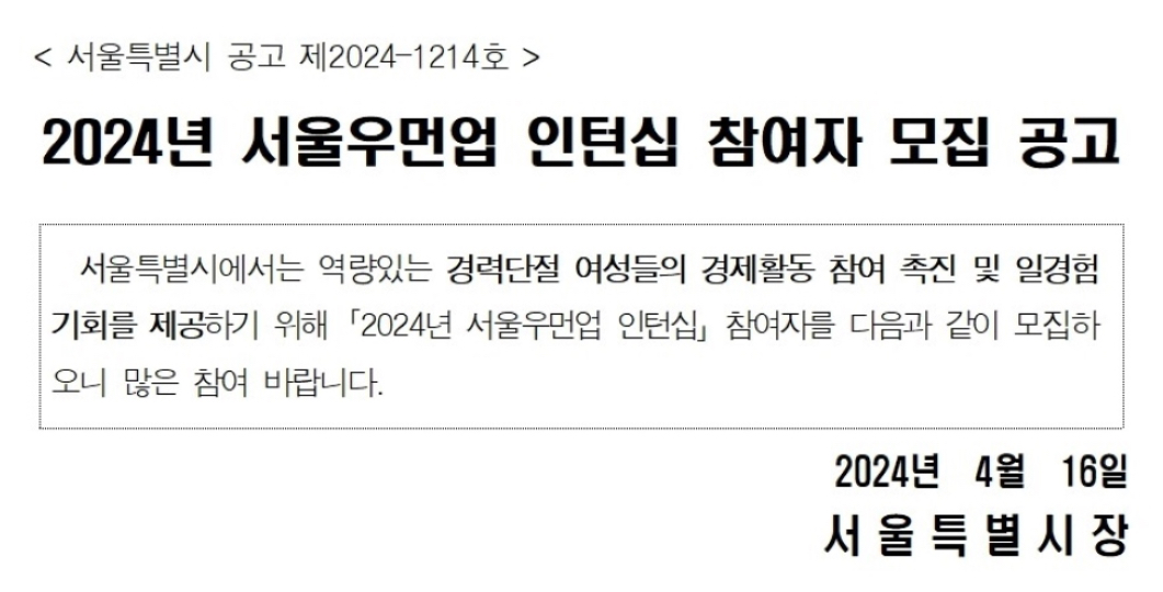 서울시가 경력보유여성의 사회진출을 돕기 위한 서울우먼업 인턴십 참여자 100명을 모집한다고 밝혔습니다.