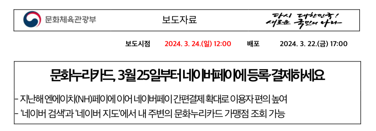 문화체육관광부와 행정안전부는 한국문화예술위원회와 함께 2024년 3월 25일(월)부터 ‘디지털서비스 개방’ 사업의 일환으로 네이버페이를 통한 문화누리카드 간편결제서비스를 제공한다고 밝혔습니다.