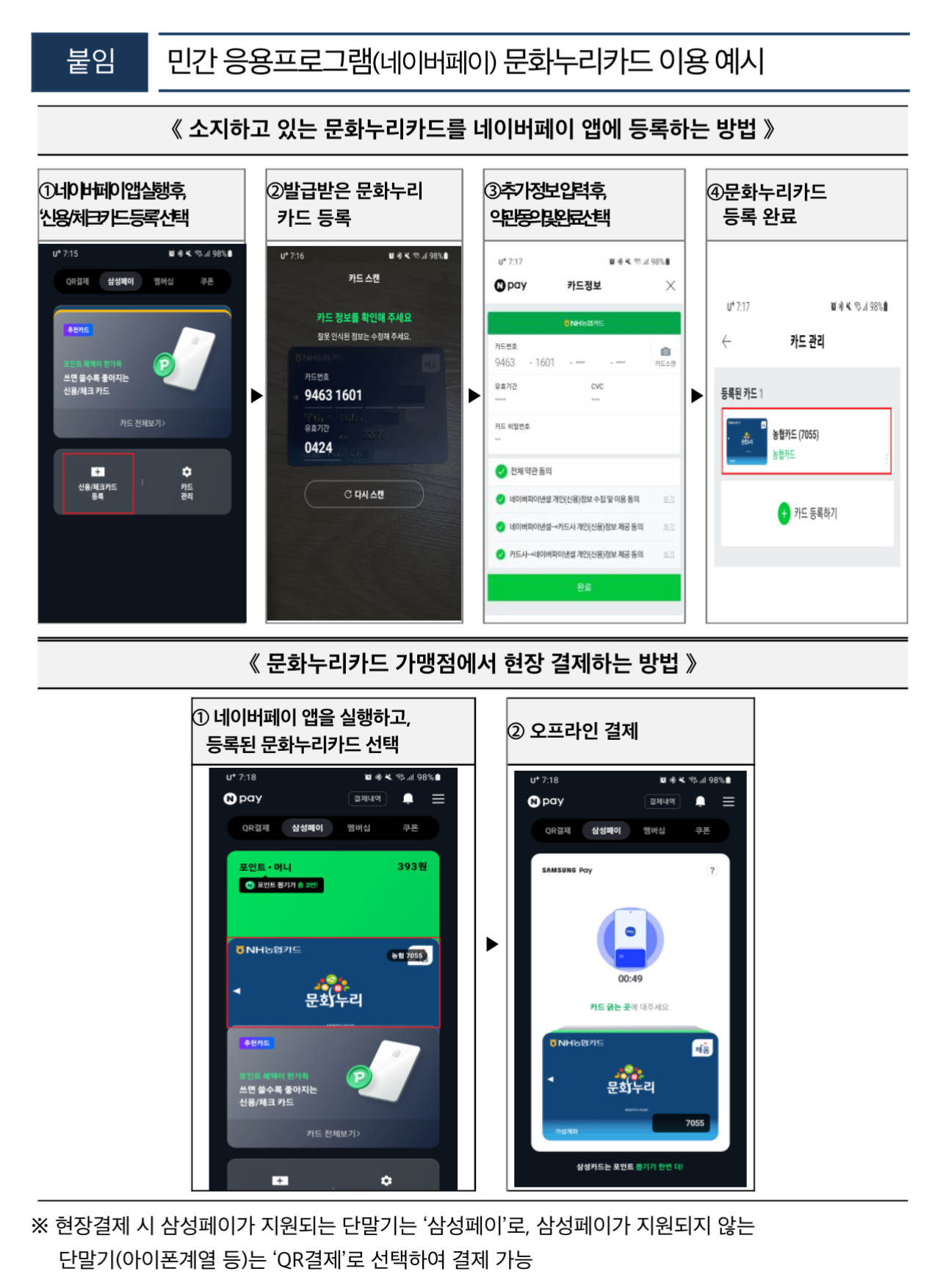 이번 ‘디지털서비스 개방’에 따라 문화누리카드 이용자는 지난해 4월, 주관카드사(NH농협카드)가 제공하고 있는 엔에이치페이(NHpay)에 이어 친숙한 민간 응용프로그램(앱)인 ‘네이버페이’로 간편결제를 할 수 있다고 합니다.