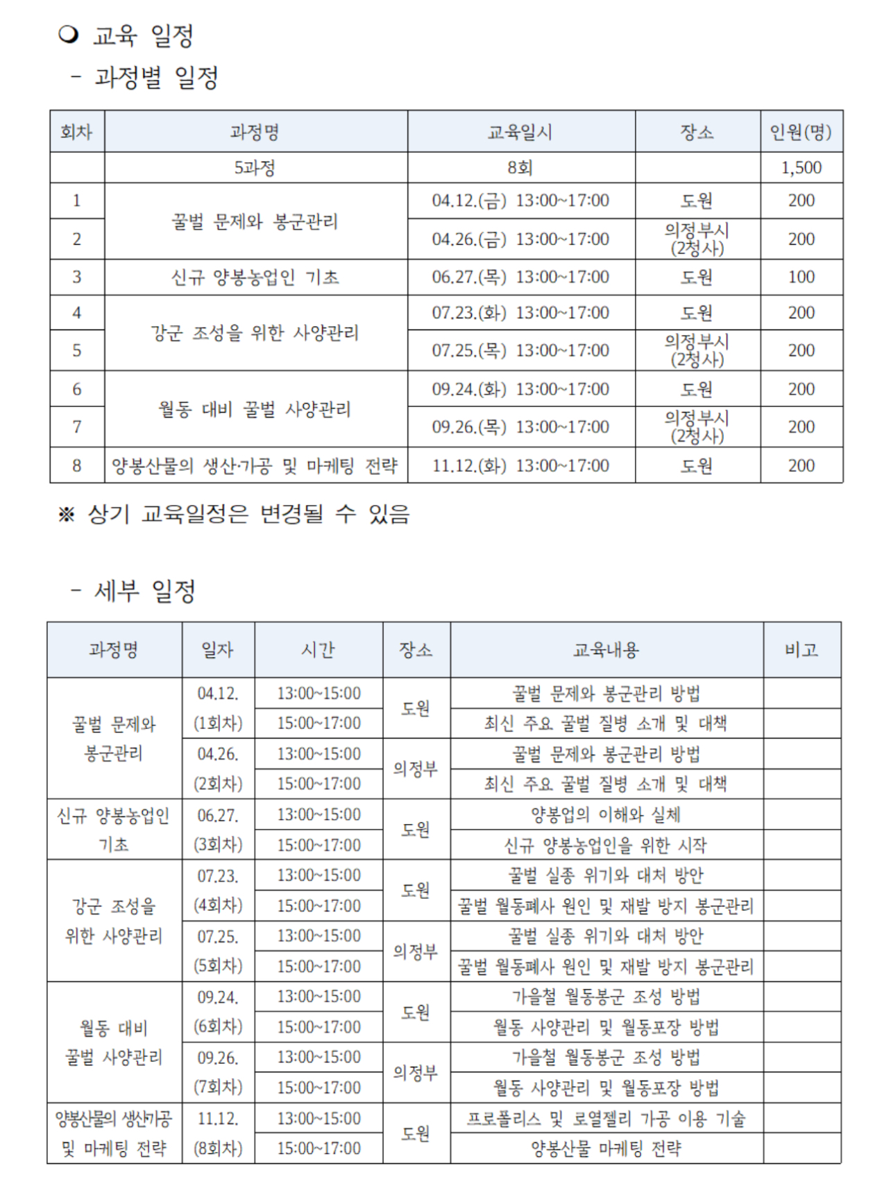 이번 교육은 기후 변화, 개체수 감소 등 꿀벌 위기에 대한 대응책을 모색하는 목적으로 ▲꿀벌 문제와 봉군관리 ▲신규 양봉농업인 기초 ▲강군 조성을 위한 사양관리 ▲월동 대비 꿀벌 사양관리 ▲양봉산물의 생산가공 및 마케팅 전략 등 총 5과정을 8회에 걸쳐 1,500명 대상으로 경기 남부와 경기 북부로 나눠 진행한다고 합니다.