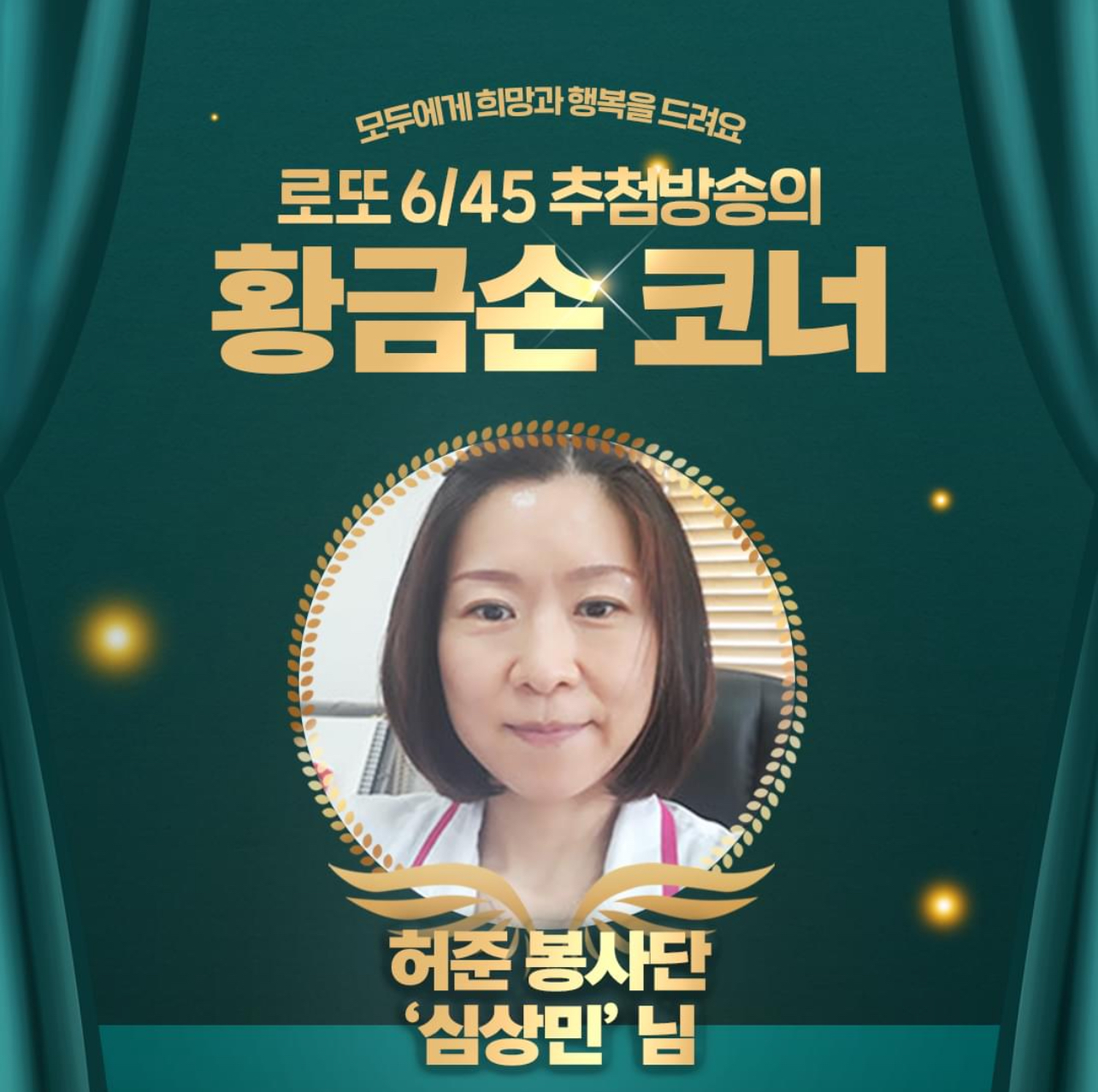 이번 주 로또 황금손 출연을 앞두고 심상민 단장은 ‘늘 봉사하고 싶은 마음이 있어도 누가 이끌어주지 못해 망설이고 있다면 허준 봉사단처럼 단체에 소속되어 각자의 능력을 조금씩 나누면 좋겠다.’라며 나눔을 독려하는 메시지를 전했습니다.