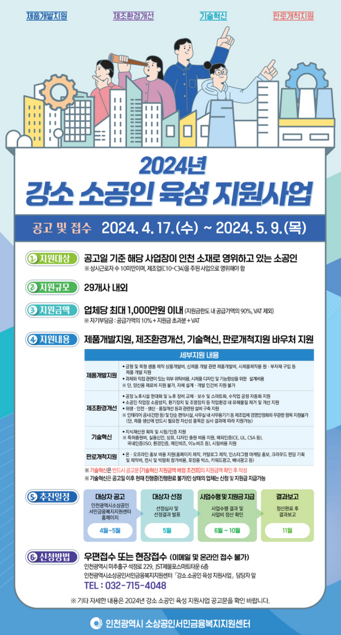 인천 강소 소공인 육성 지원 신청 모집기간은 2024년 4월 17일부터 5월 9일까지입니다.