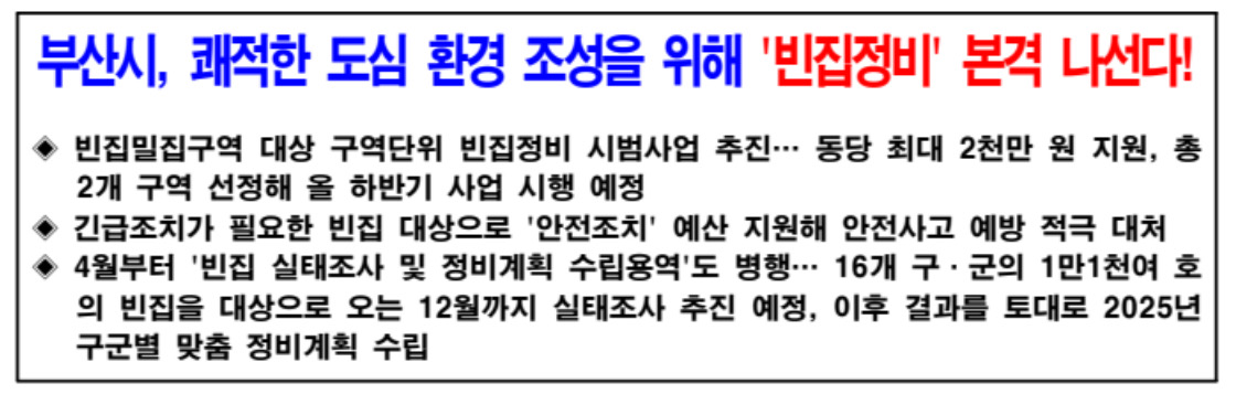 2024년 4월부터 부산진구, 남구, 금정구를 시작으로 16개 구․군의 1만 1천여 호의 빈집에 대해 순차적으로 실태조사를 진행할 예정이라고 전했습니다.