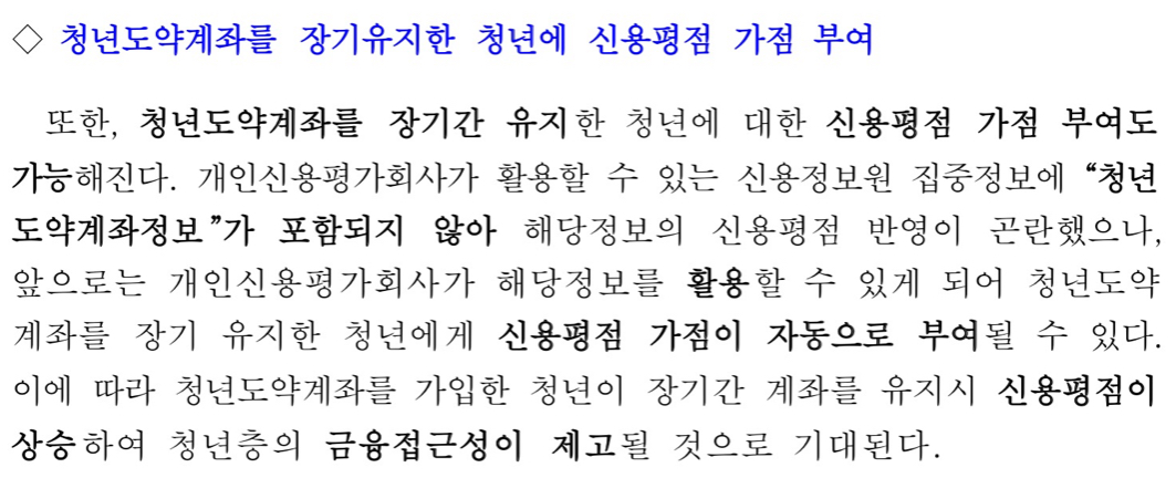 금융위원회에 따르면 청년도약계좌를 장기간 유지한 청년에 대한 신용평점 가점 부여도 가능해진다고 합니다.