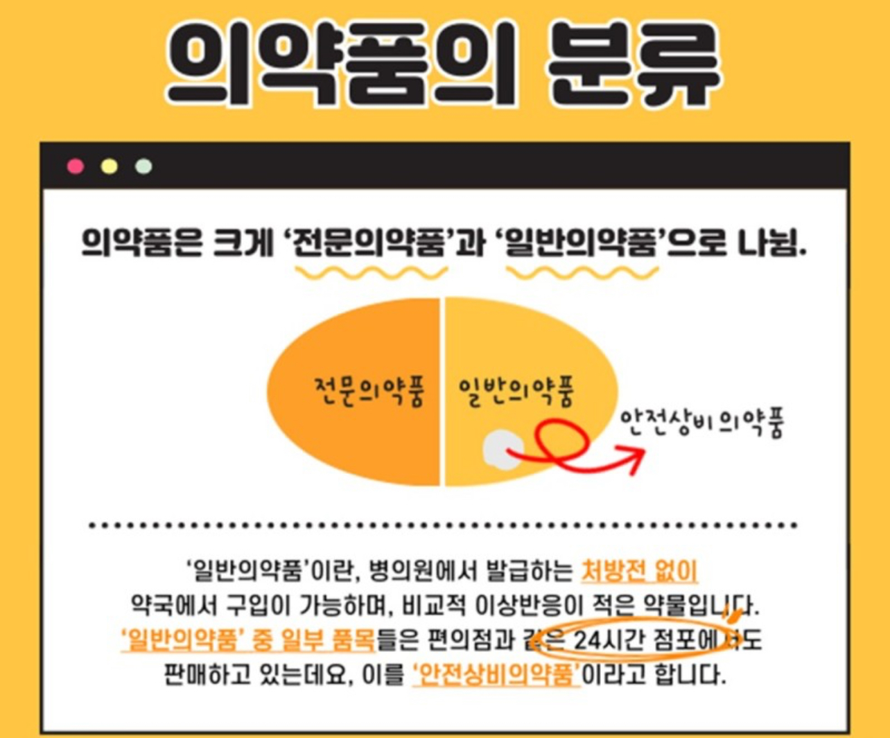'일반의약품' 중 일부 품목들은 편의점과 같은 24시간 점포에서도 판매하고 있는데 이는 '안전상비의약품'이라고 합니다.