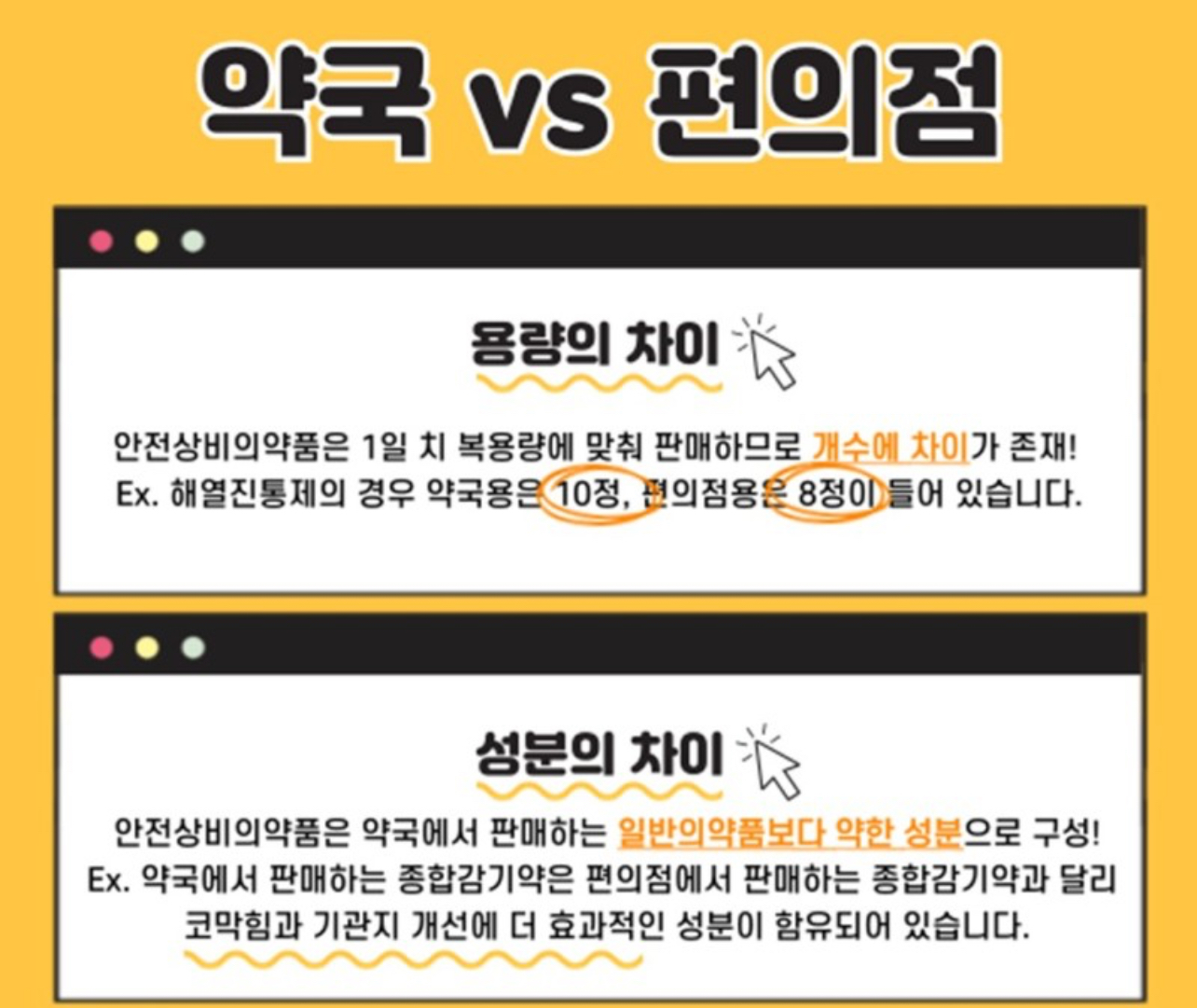 안전상비의약품은 약국에서 판매하는 일반의약품보다 약한 성분으로 구성하는데 약국에서 판매하는 종합감기약은 편의점에서 판매하는 것보다 코막힘, 기관지 개선에 더 요화적인 성분이 함유되어 있음