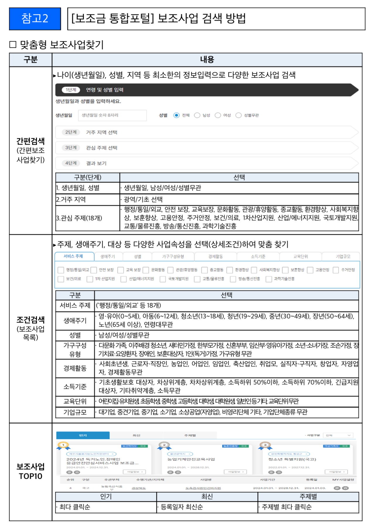 ➊ (맞춤형 검색) 국민은 나이‧성별 등의 본인정보나 대상‧지역‧주제 등의 관심정보를 입력해 간편하게 맞춤형 보조금을 검색