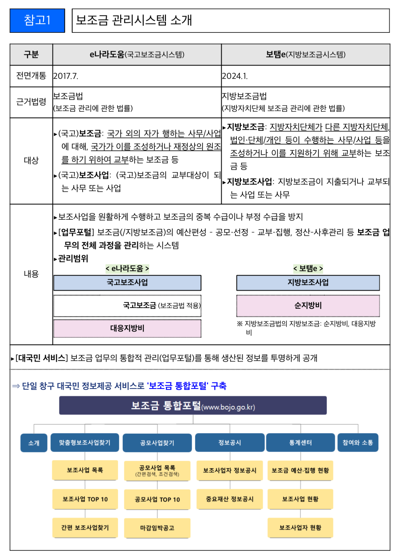 보조금이 궁금할 때 지금까지 국고보조금은 e나라도움(국고보조금통합관리시스템, 2017.7.~)에서, 지방보조금은 보탬e*(지방보조금관리시스템, 전면개통 2024.1.)에서 따로 확인해야 했습니다.