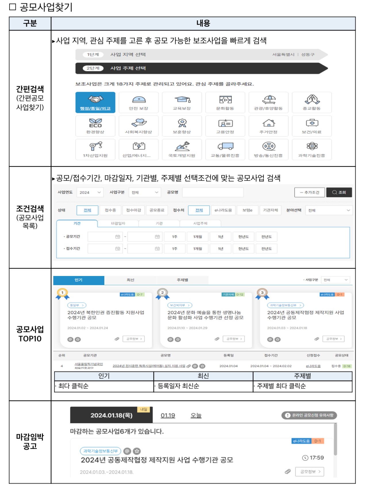 ❷ (공모사업 검색) 보조사업자는 사업지역, 관심주제 등 선택조건에 맞는 공모사업 검색 후 수행가능한 보조사업을 신청 가능