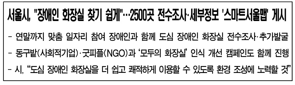 서울시는 도심 내 장애인 화장실 2,500개를 전수 조사해 입구단차 등 세부 정보를 ‘스마트서울맵(https://map.seoul.go.kr/smgis2/)’에 게시할 예정이라고 밝혔습니다.