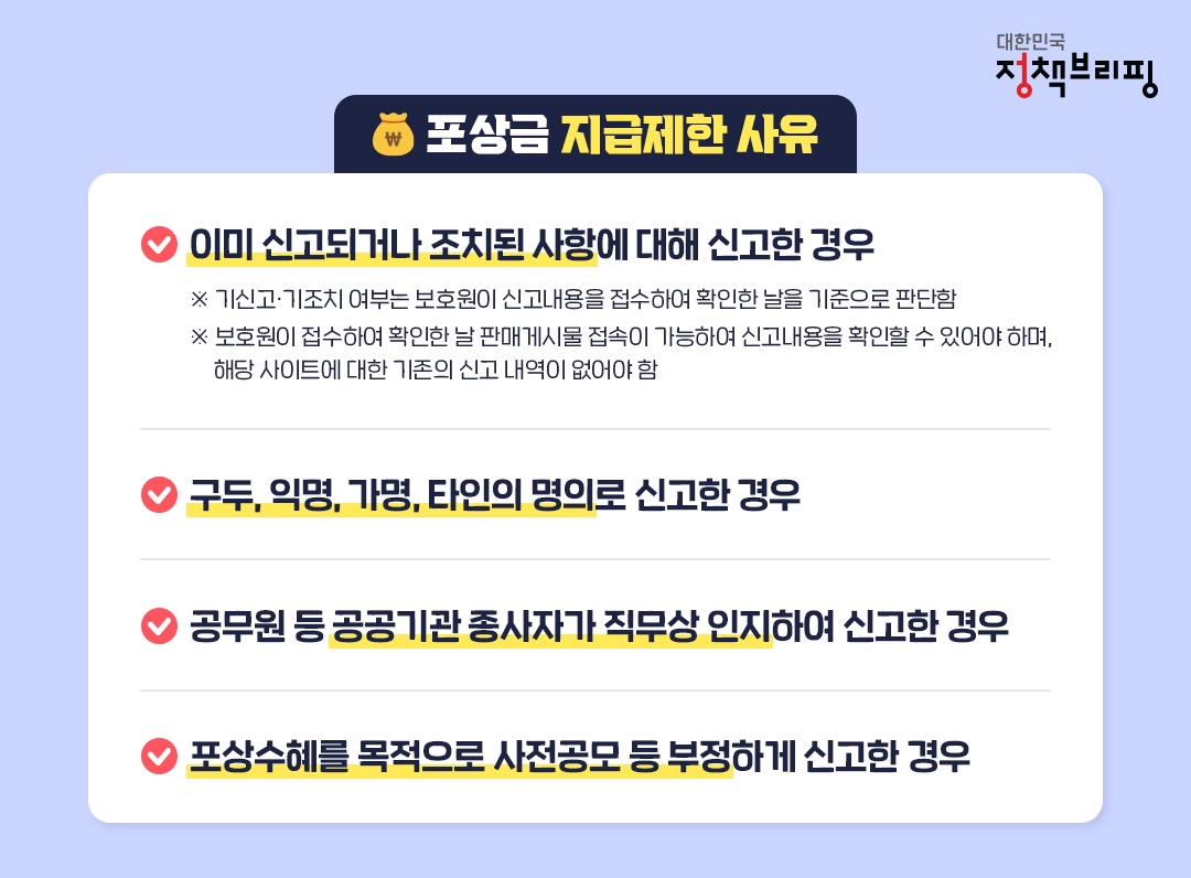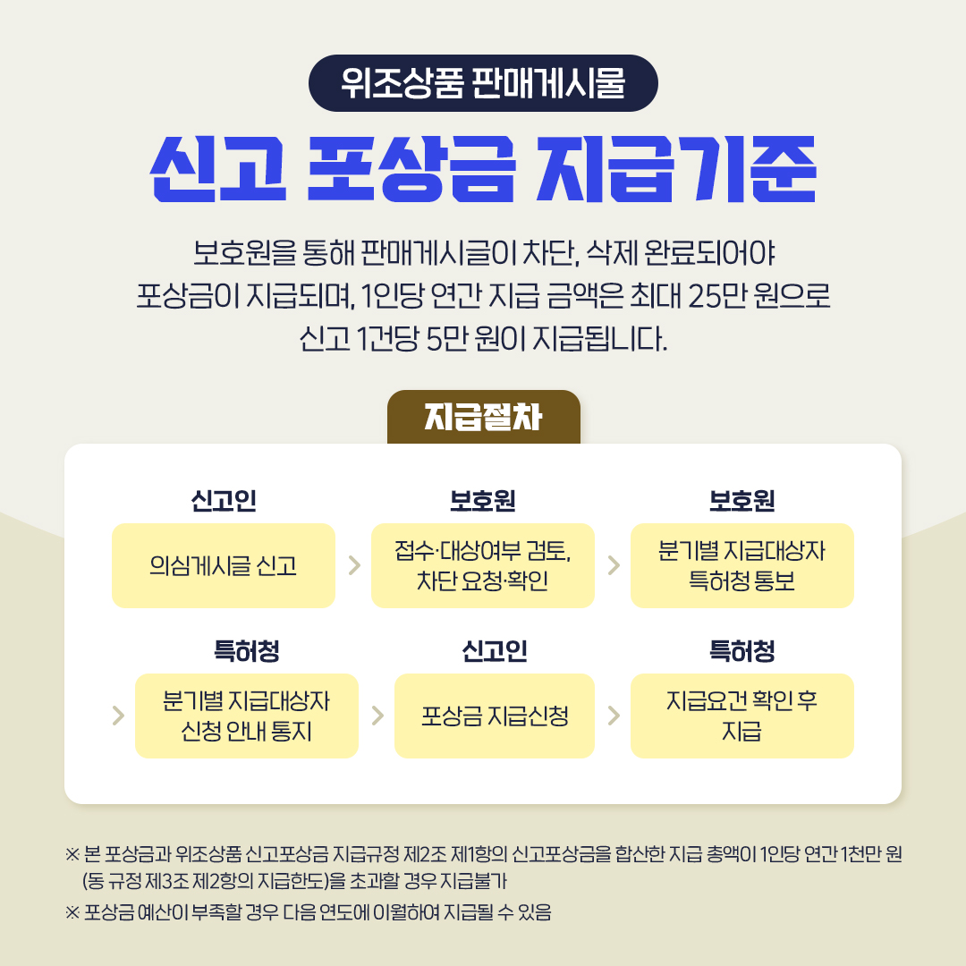 보호원을 통해 판매게시글이 차단, 삭제 완료되어야 포상금이 지급되며 1인당 연간 지급 금액은 최대 25만 원으로 신고 1건당 5만 원이 지급됩니다.