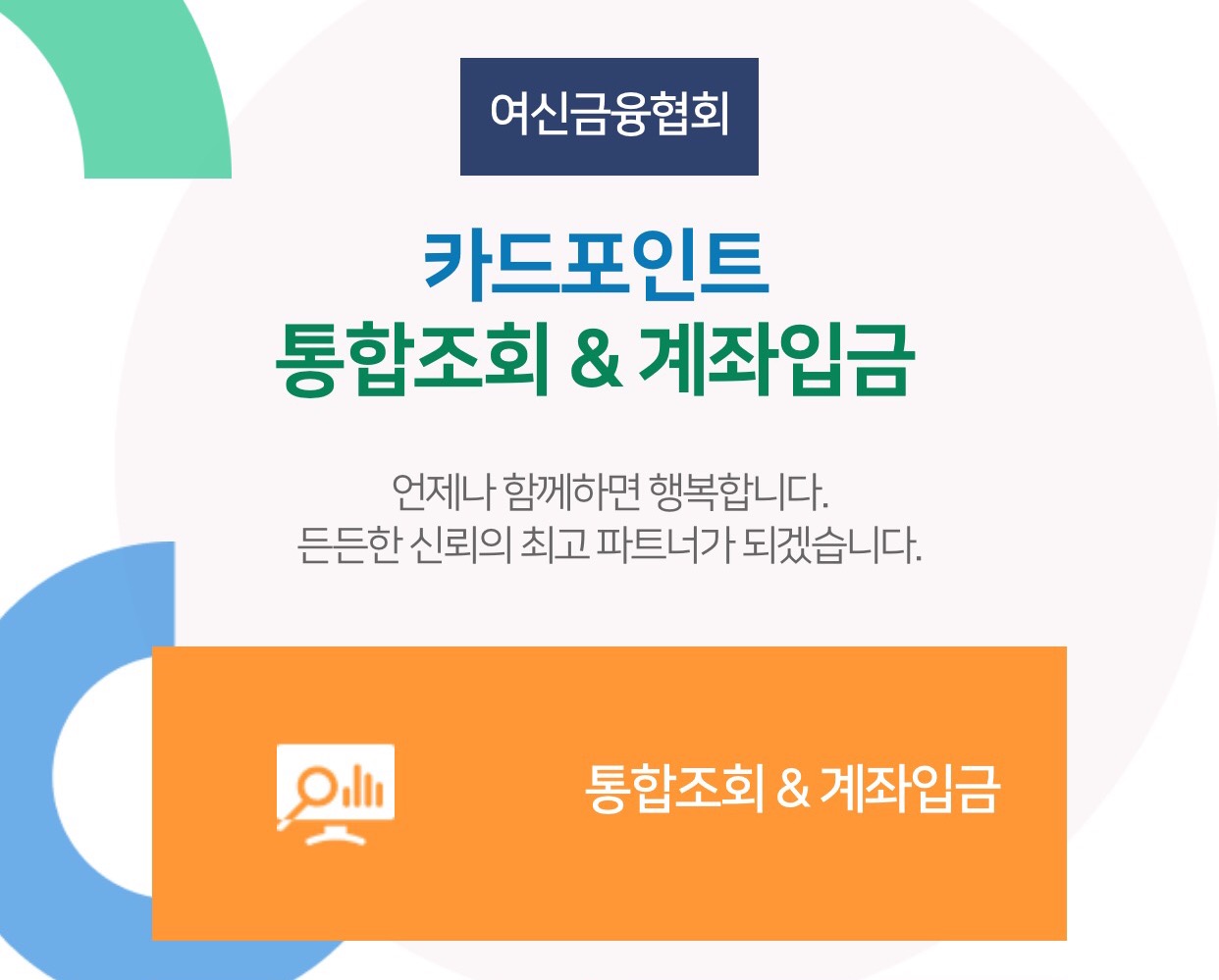 여신금융협회 카드포인트 통합조회 & 계좌입금 언제나 함께하면 행복합니다. 든든한 신뢰의 최고 파트너가 되겠습니다.