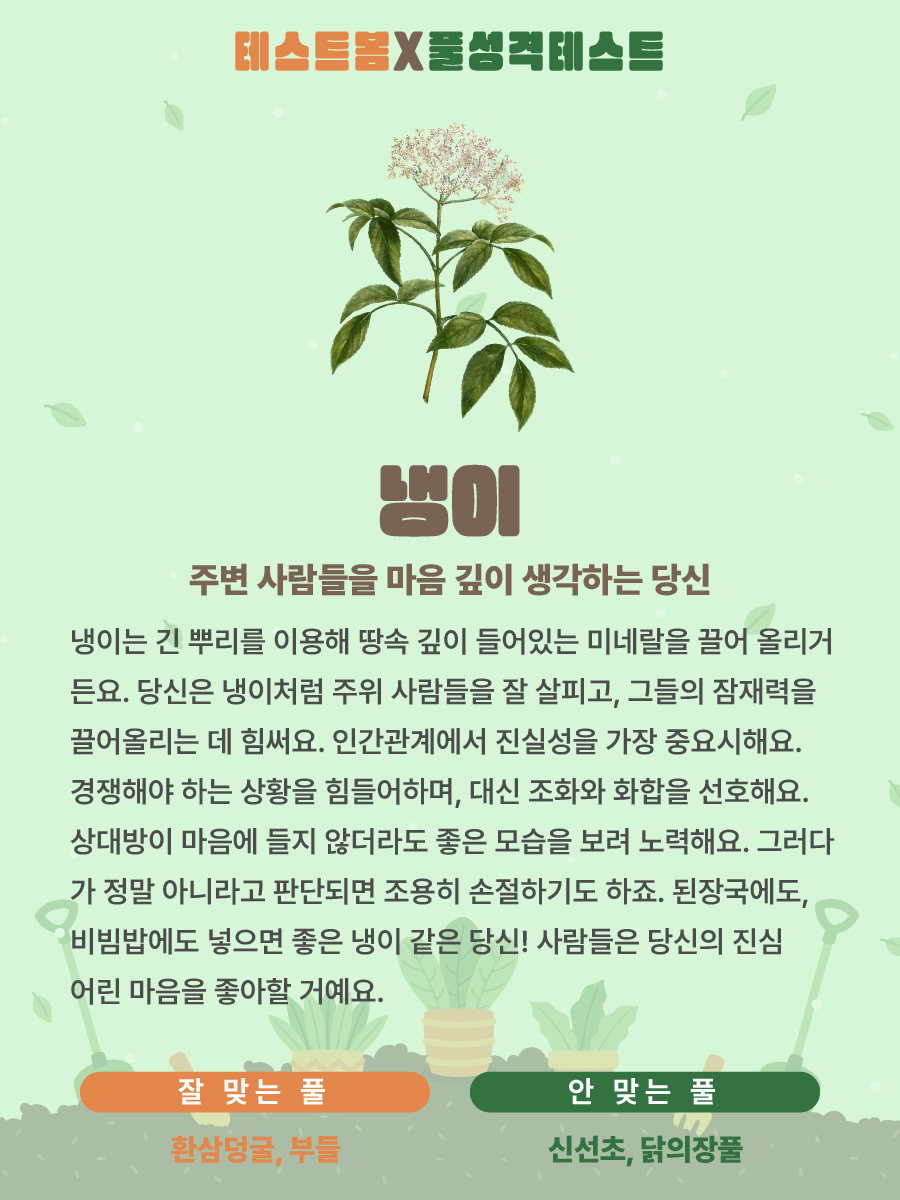 당신은 냉이처럼 주위 사람들을 잘 살피고, 그들의 잠재력을 끌어올리는 데 힘써요.