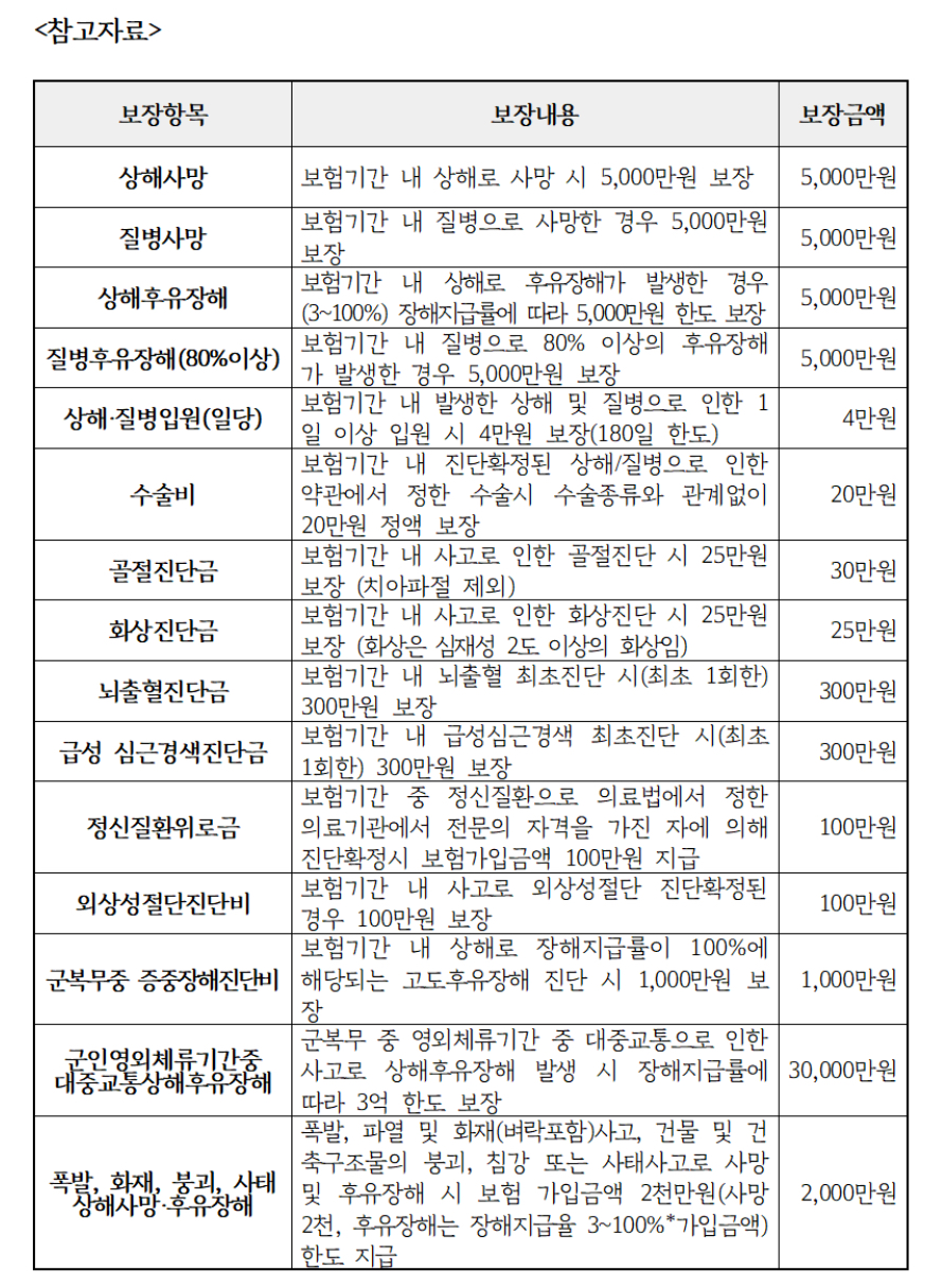 보장 내용은 ▲상해사망·후유장해 진단 시 5천만 원 ▲질병사망·후유장해 진단 시 5천만 원 ▲수술비 20만 원 ▲입원일당 4만 원(최대 180일) 등이다. 폭발, 화재, 붕괴 사태로 인한 상해사망이나 후유장해 시 2천만 원이 추가 지급됨에 따라 최대 7천만 원이 보장되며, 보험금은 군 치료비나 개인보험과 별도로 받을 수 있습니다.