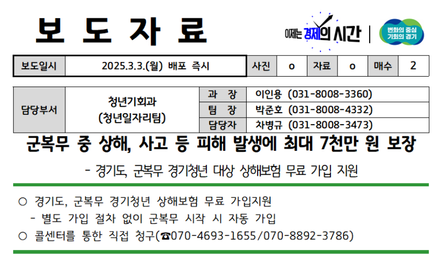 이인용 경기도 청년기회과장은 “군복무 중 사고를 당한 청년과 가족의 경제적 어려움을 덜고 사회 안전망을 강화하는 데 최선을 다하겠다”라고 말했습니다.