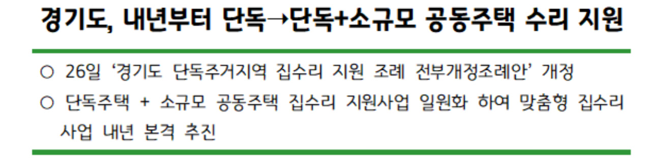 경기도가 2025년 내년부터 노후 단독주택뿐만 아니라 다세대주택, 연립주택 등 소규모 공동주택까지 일원화해 집수리 비용을 지원할 수 있는 제도적 기반이 마련됐다고 합니다.