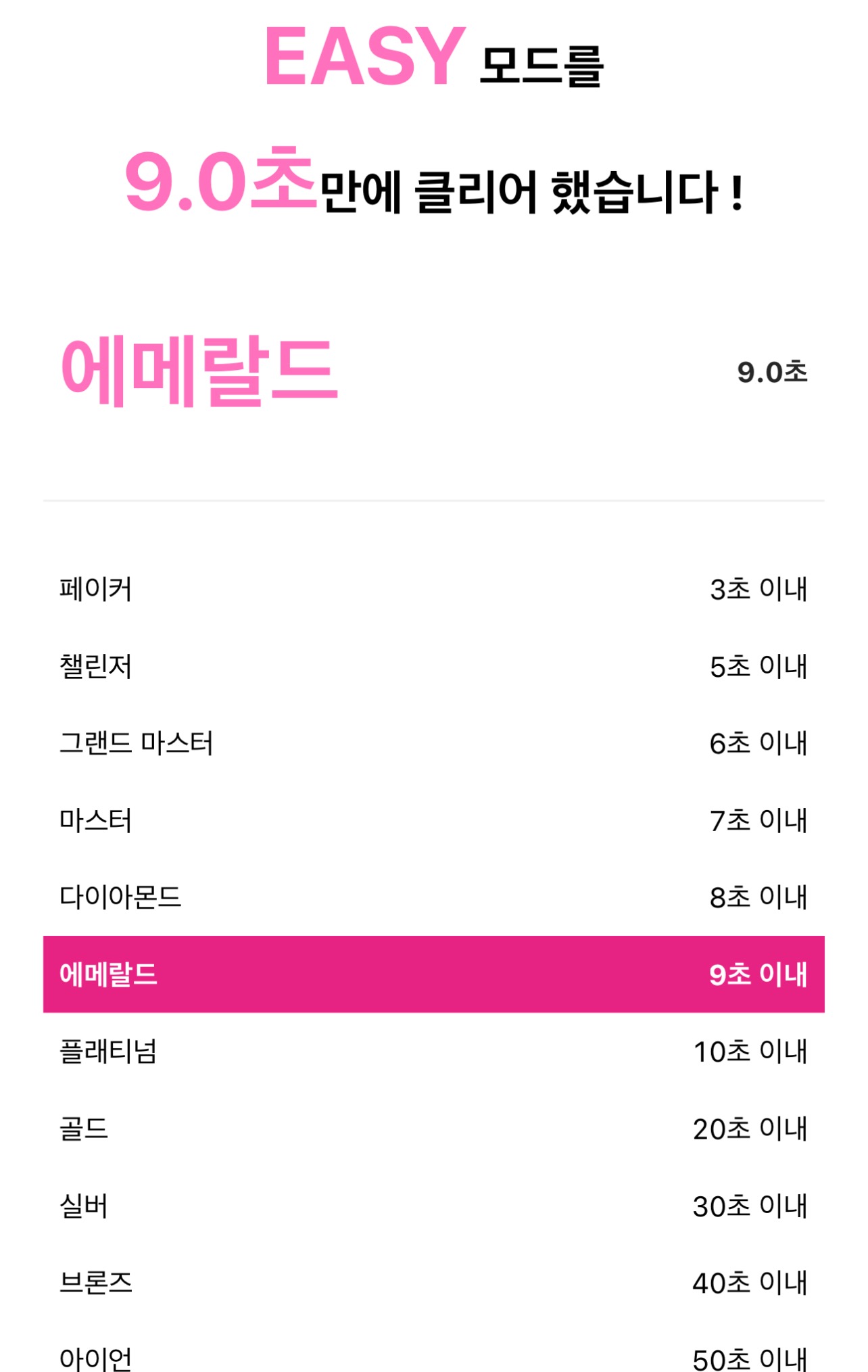 9초만에 클리어했으며 페이커, 챌린저, 그랜드 마스터, 마스터, 다이아몬드, 에메랄드, 플래티넘, 골드, 실버, 브론즈, 아이언 중에서 에메랄드 등급이 나왔습니다.