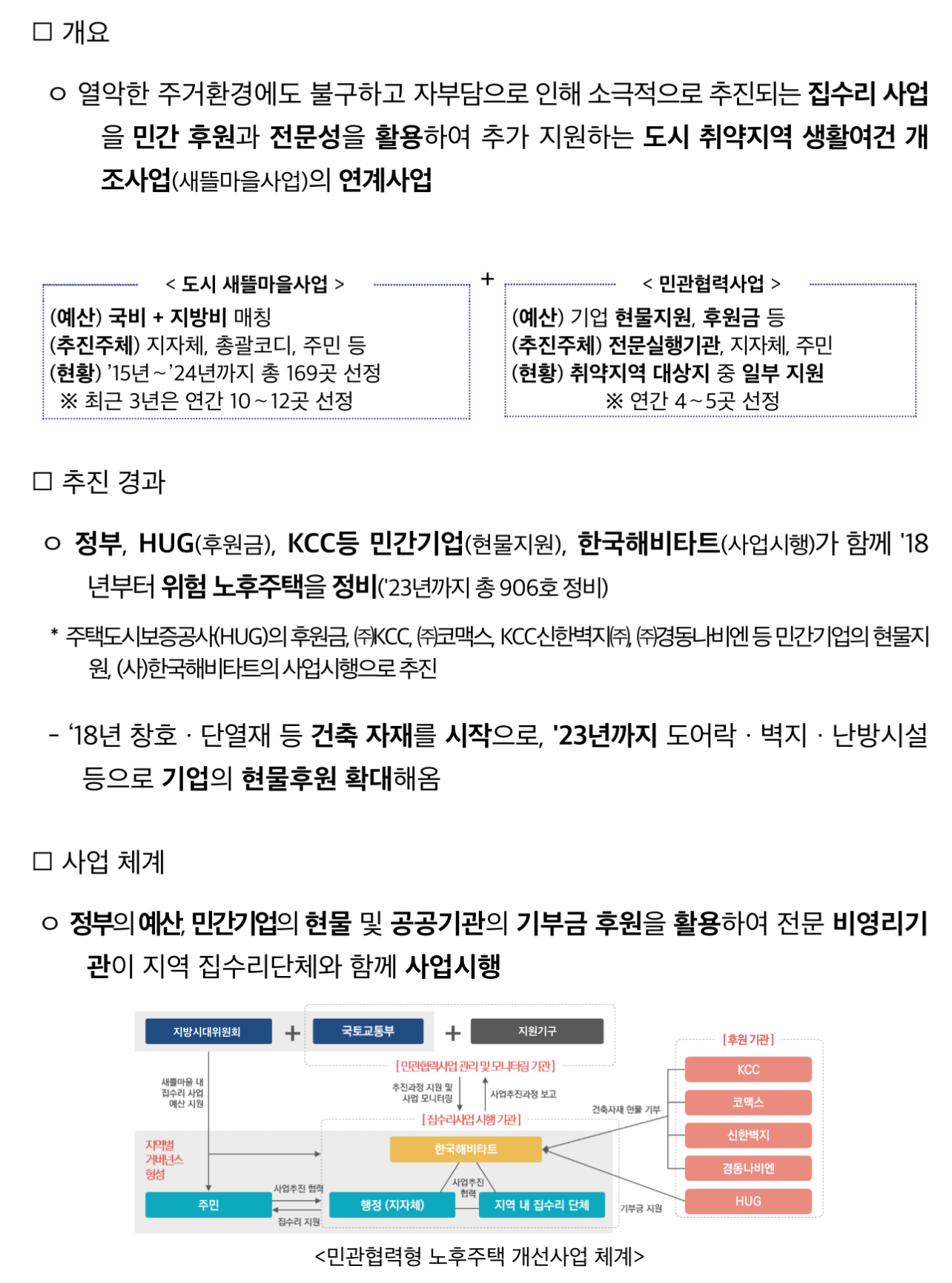 정부는 기본적인 생활여건이 확보되지 않은 도시 내 낙후지역을 지원하는 도시 새뜰마을사업('15∼현재)이 재정지원 중심으로 시행되는 한계를 보완하기 위해 2018년부터 민관협력형 노후주택 개선사업을 함께 추진해 오고 있다.(2023년까지 총 906호의 노후주택 개선)