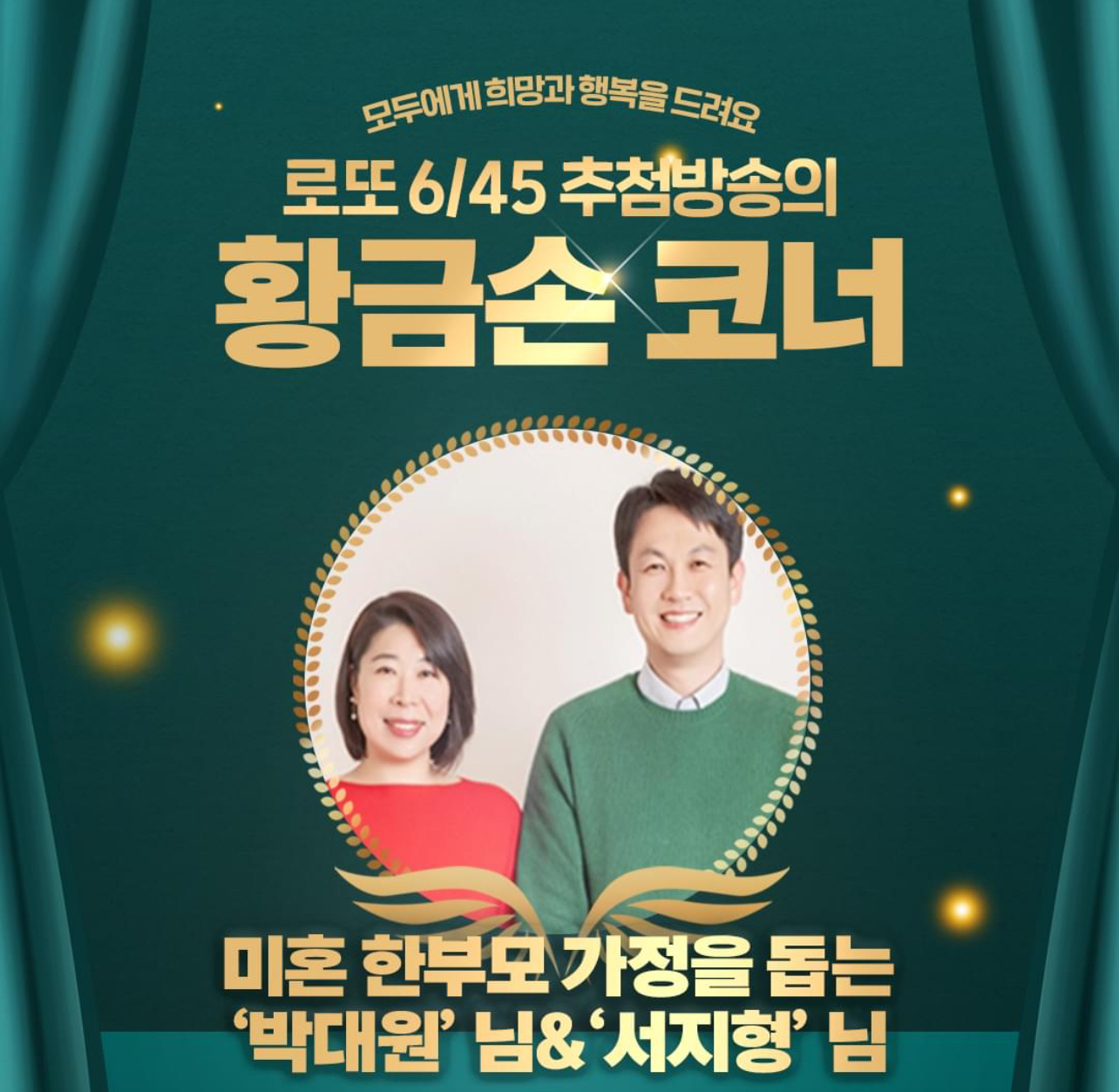 미혼 한부모 가정을 돕는 박대원, 서지형 부부가 1118회 MBC '생방송 행복드림 로또 6/45'의 '황금손'으로 출연한다고 합니다.