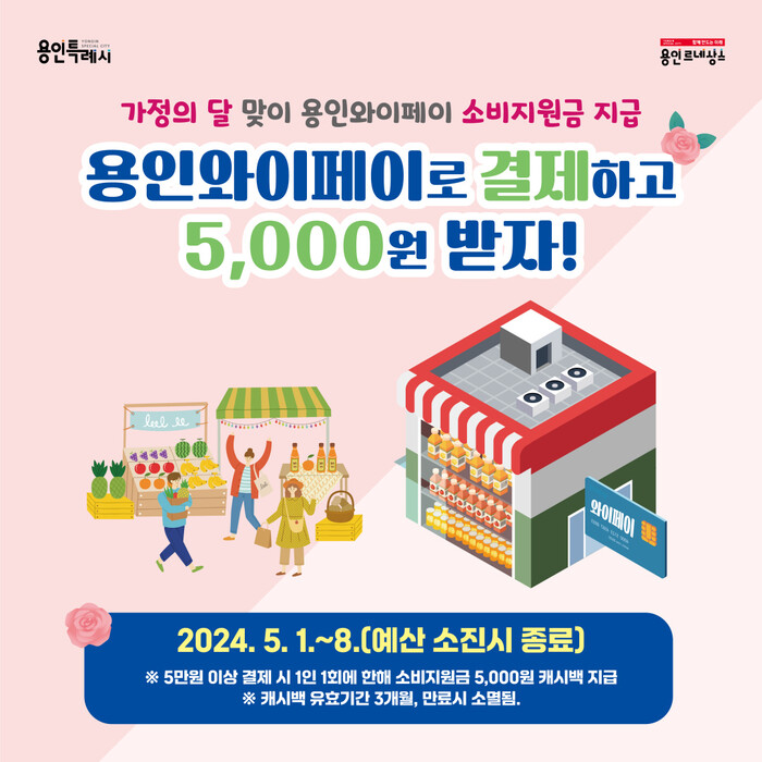 용인특례시는 2024년 5월 8일까지 용인와이페이 사용자를 대상으로 소비지원금(캐시백) 지급 행사를 한다고 밝혔습니다.